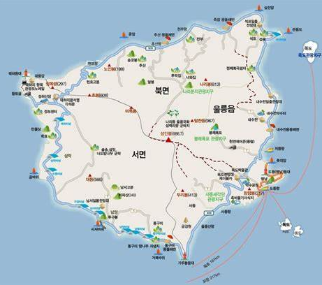 울릉도는 대한민국 동쪽에 위치한 작은 섬으로, 동해의 일부를 이루고 있습니다. 울릉도는 울릉군에 속하며, 울릉도와 동도 두 개의 주요 섬으로 구성되어 있습니다.울릉도는 푸른 동해와 천혜